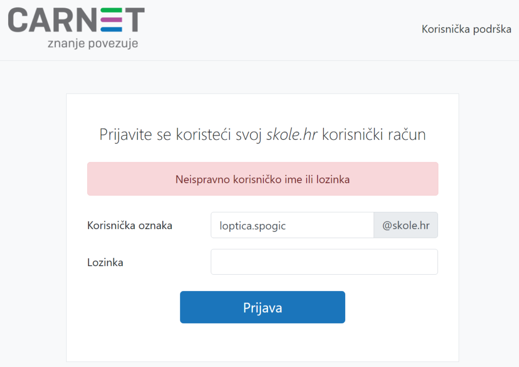 • ako se u adresi stranice na kojoj upisujete podatke za prijavu ne nalazi domena skole.hr, jeste li napisali korisničko ime u obliku ime.prezimeX@skole.hr